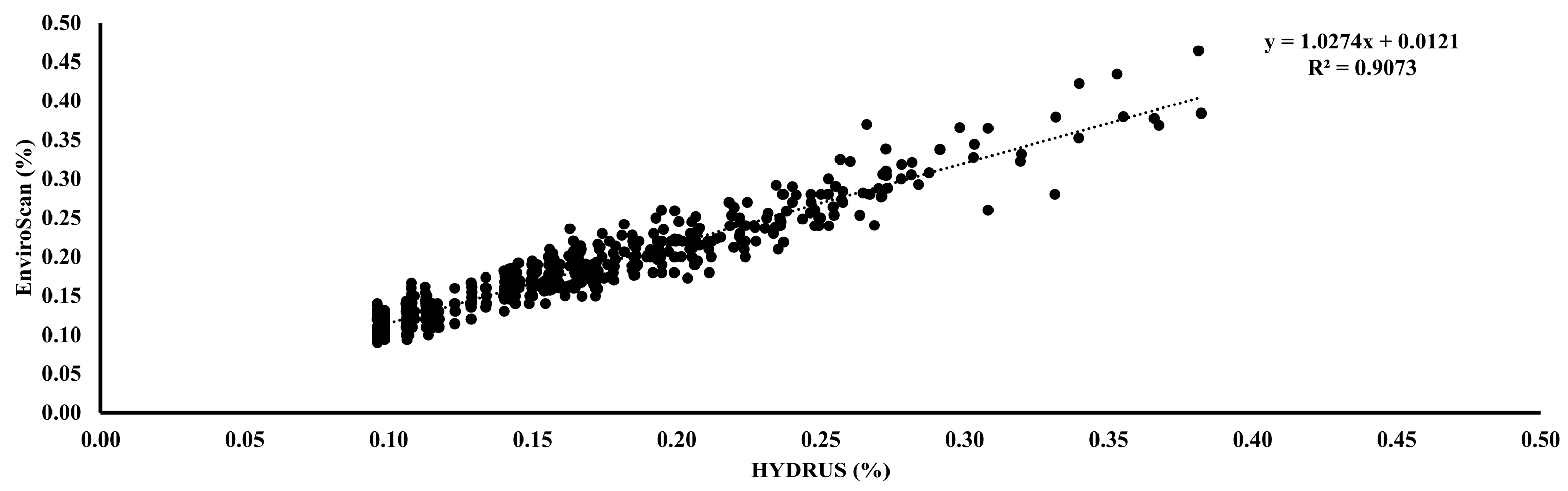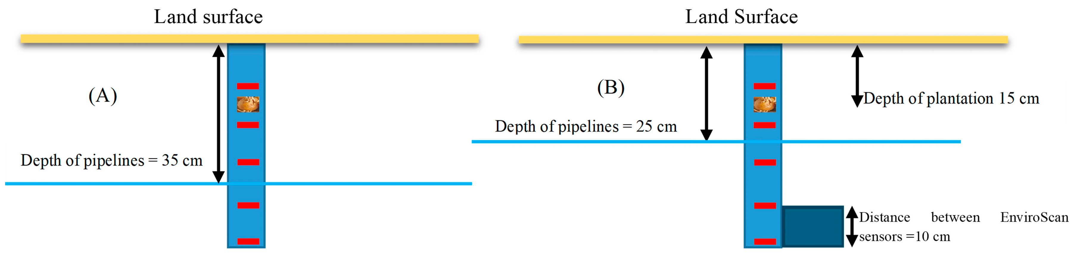 - Al-Ghobari, H.M.; El Marazky, M.S.A. Field evaluation of EnviroSCAN performance for monitoring soil water content compared with other soil moisture sensors under arid conditions. Wulfenia J. Klagenf. Austria 2013, 20, 54–70. [Google Scholar]