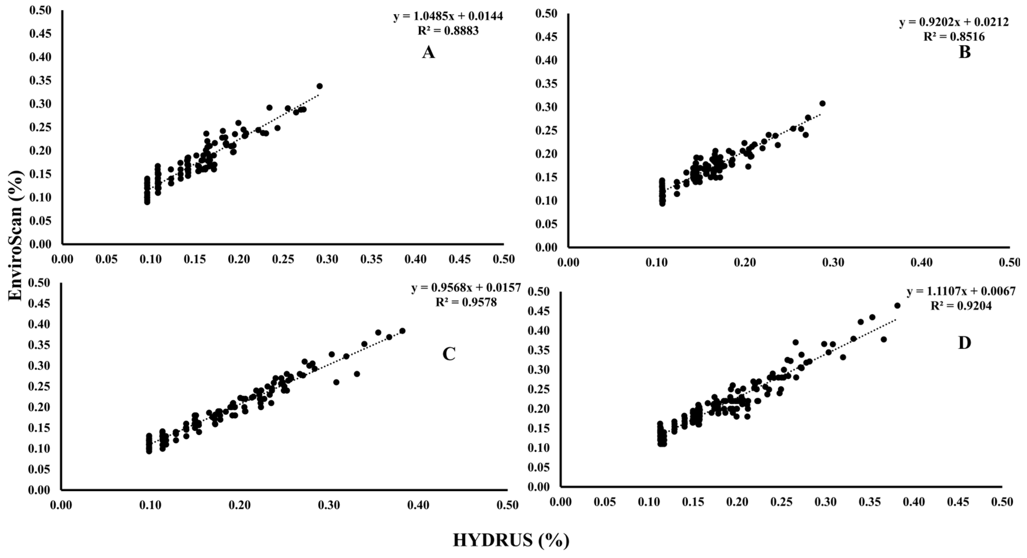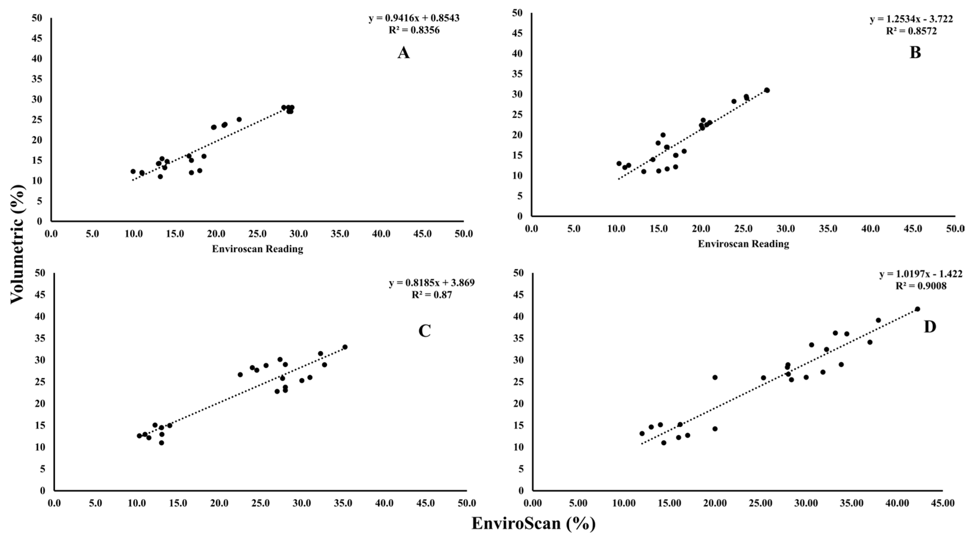 - Jabro, J.; Leib, B.; Jabro, A. Estimating soil water content using site-specific calibration of capacitance measurements from Sentek EnviroSCAN systems. Appl. Eng. Agric. 2005, 21, 393–399. [Google Scholar] [CrossRef]