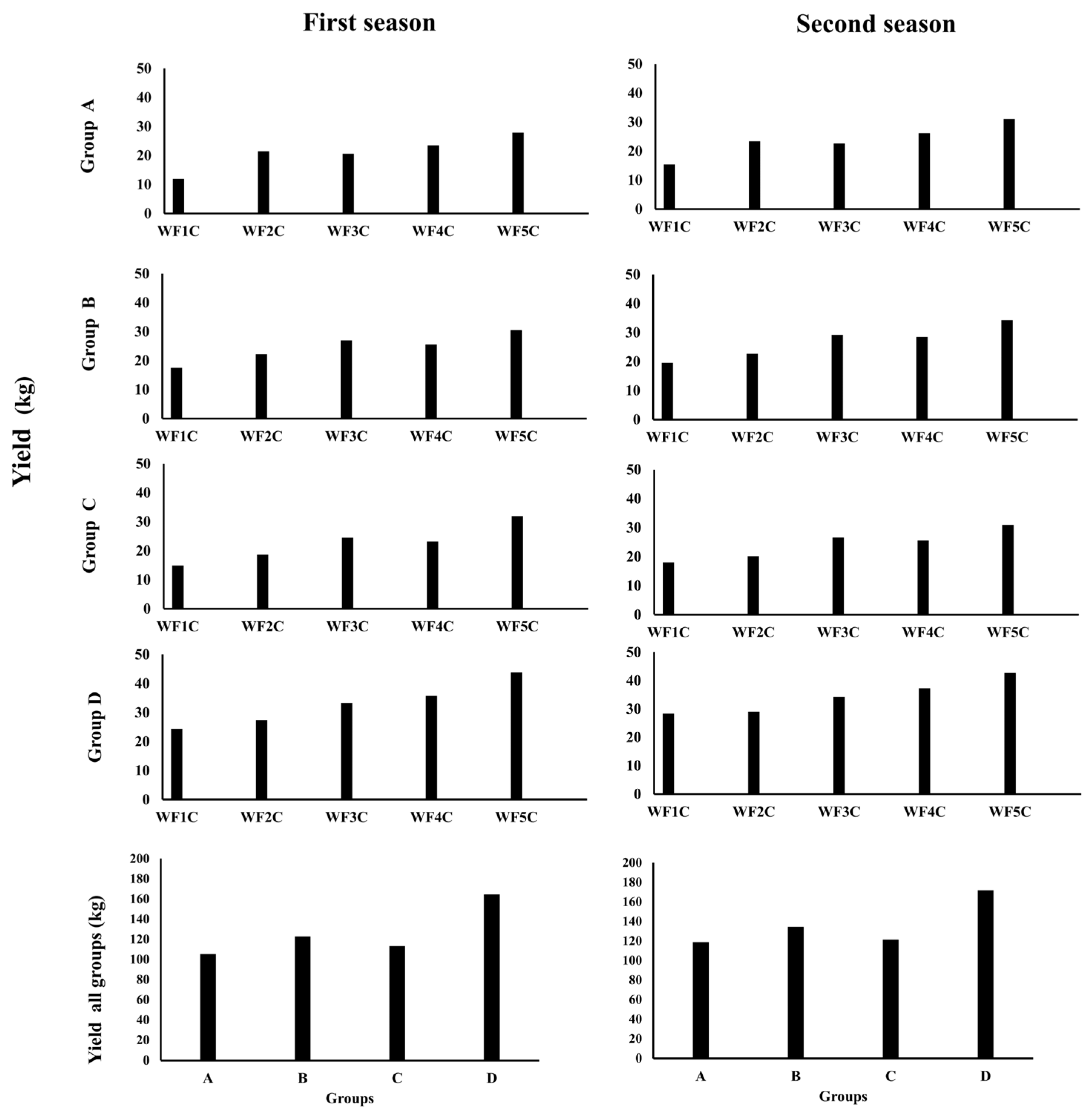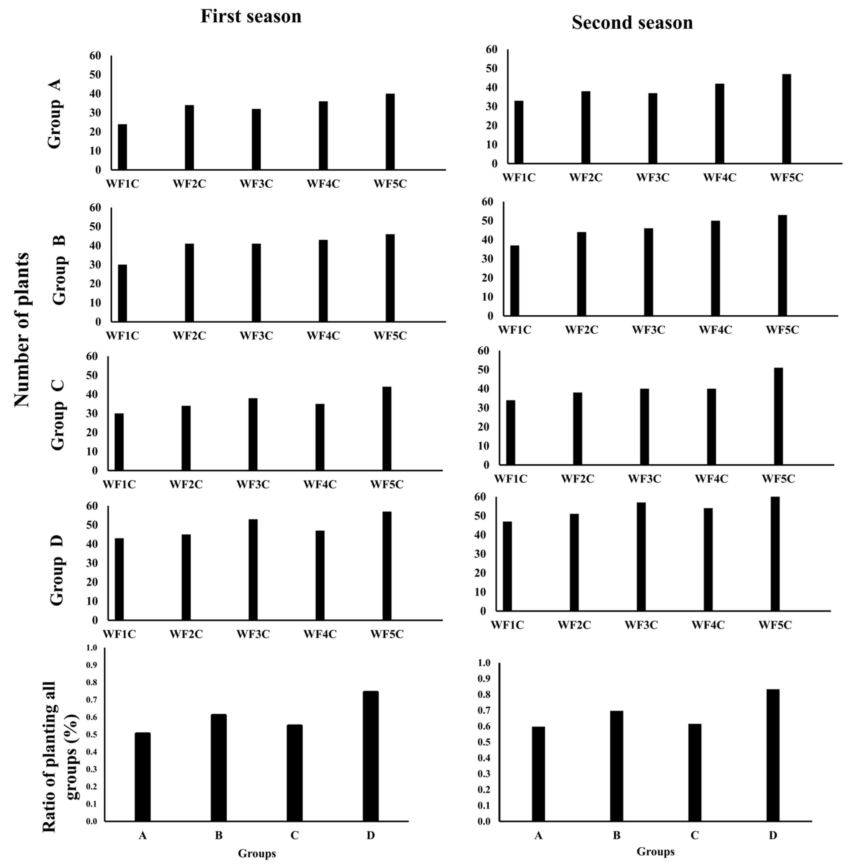 | Season | Group | Plant Count (Mean ± SD) | Weight (kg) (Mean ± SD) | Productivity (kg) | Germination Rate |