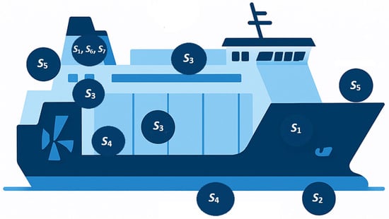 The subject vessel is a large ferry designed for daily passenger and freight transport across the Baltic Sea [,,]. In total, seven subsystems are distinguished in its architecture: