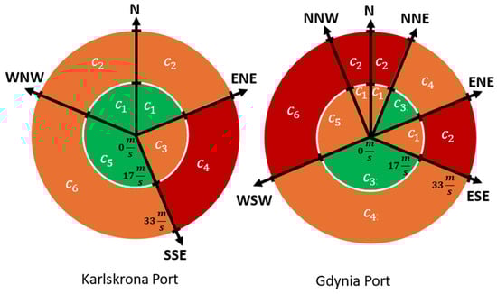 Graphic representation of weather states for Karlskrona (left) and Gdynia (right) ports in relation to wind direction and wind speed (weather states assigned to the inner ring correspond to wind speeds in the interval [0 m/s, 17 m/s), whereas those assigned to the outer ring correspond to wind speeds in the interval [17 m/s, 33 m/s)). Hazard levels applied for weather-state classification are: 0os—no hazard (green); 1st—moderate hazard (orange); 2nd—severe hazard (red).