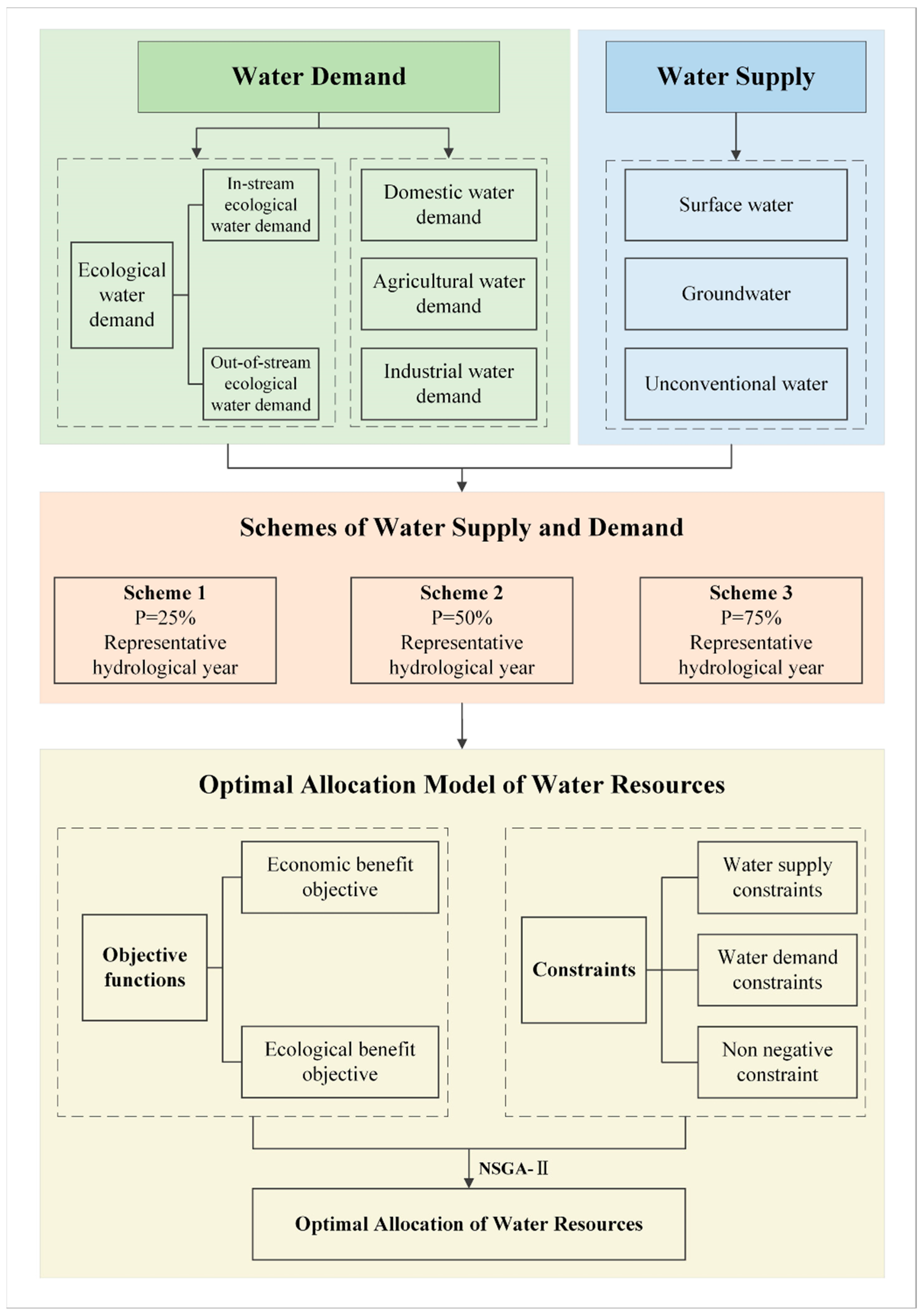 20]. Therefore, this study investigates the optimal allocation of water resources based on ecological water demand, which adopts the improved Tennant method to determine accurate ecological water demand values and follows the principle of ecological water use priority in the process of water resources distribution.
