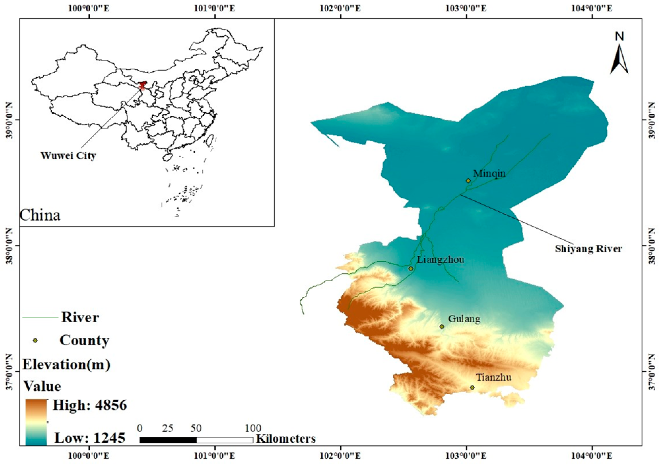 3, respectively. From the above results, Liangzhou and Tianzhu’s water resources consumption are relatively high, accounting for 27.93% and 40.38% of total water resources consumption of Wuwei. For Liangzhou, as the key agricultural production area in Gansu Province, as well as a major grain-production area in China, the agricultural water resources consumption is always high. Tianzhu, on the other hand, due to its large areas of shrubland, open forest land, high-cover grassland, and mid-cover grassland, accounts for 89.07% of Wuwei city’s total vegetation ecological water resources demand, as shown in