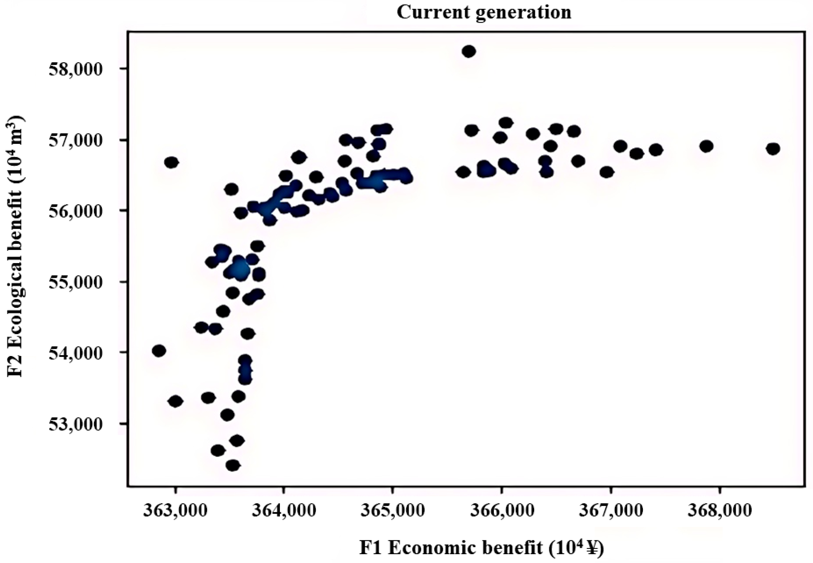 According to the water scarcity and ecological environment deterioration in Wuwei City, a multi-objective water resources optimization allocation model based on ecological water demand was established, which makes economic benefit maximization and ecological benefit maximization as objectives and water supply, water demand, and food security as constraints. And the NSGA-Ⅱ algorithm is employed to solve the established multi-objective model. Initially, the population size and number of generations have been set as 100 and 2, respectively. Moreover, in the calculation, crossover and mutation rate are not assigned exact values. Specifically, when generating a new population, the code executes a crossover operation for each parental couple, followed by a mutation subsequent to the crossover, which can guarantee that the population consistently engages in extensive exploration, hence avoiding premature convergence. During the solution process, the Pareto front solution set can be obtained, as shown in