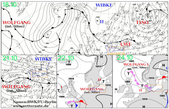Synoptic maps of Wolfgang low shifts from 18 to 24 October 2023 (source: 67), red names are lows, blue are highs, orange rectangle—studied area.