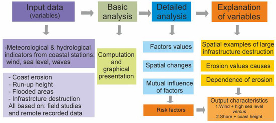 The materials are the changes in sea level and wind velocity during the storm caused by the Wolfgang cyclone, erosion of the coast, and destruction of infrastructure. The methods used are described below and also include the latest source of data originating from social media on the internet, recorded during the ongoing phenomenon. This study includes in situ data and was performed remotely. In this study, diversified methods and techniques of data analysis were used (Figure 3):