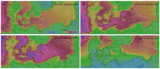 Wind changes over the south Baltic during the Wolfgang low, 19–21 October 2023 (maps source: 52). (A)—Strong E wind in the western part of the Baltic Sea with low close to the European coast. (B)—Very strong wind on the western part of the coast with low stabilised over the north European coast. (C)—Growth of wind velocity over the whole southern Baltic Sea, maximum over the Danish islands and Scania. (D)—Wind over the Baltic Sea decreased and shifted towards the north when the low moved north (source: [69]).