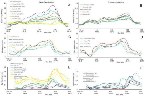 Hydro-meteorological conditions of the surge Wolfgang in selected harbours along the southern Baltic coast. (A)—Changes in the sea level in the direction west–east. (B)—Changes in the sea level in the direction south–north. (C)—Changes in the wind velocity in the direction west–east. (D)—Changes in the wind velocity in the direction south–north. (E)—Changes in the wave height between the east and west coast, from the WAM model near harbours. (F)—Changes in wave height between south and north, from WAM model near harbours (own graphs based on raw data sources [62,63,64,65,66,67,68,69,70]).