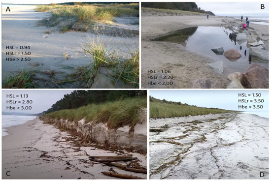 Run-up (HSLr, m) marks related to different sea levels (HSL, m) on the coast with different beach heights (Hbe, m); debris is marking SLr height, 22–24 October 2023 (photos T. Łabuz). (A)—Washover fan on beach height similar to SLr = 1.5 m, Świnoujście. (B)—Eroded dune and beach lower than SLr = 2.2 m, Kolpinsee. (C)—Eroded beach and dune lower than SLr = 2.8 m, Prora, Rügen. (D)—No dune erosion on beach higher than SLr = 3.5 m, Wustrow.
