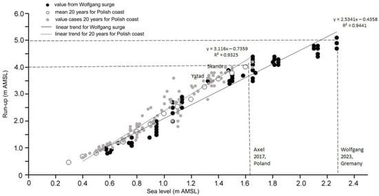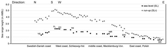 The height of the run-up (SLr) determines the height of the beach (coast) where the wetlands, dunes (or cliffs), or waterfront will be eroded. At sea levels up to 1 m AMSL (SW), the run-up reached 1.5 m AMSL. At sea levels up to 1.5 m AMSL (WR), the run-up reached 3–3.5 m AMSL. On the western part of the coast, the run-up reached up to 5 m AMSL. Along the southern Baltic coast, the run-up was related to the sea level, and the highest reached 5.2 m AMSL in Flensburg (Figure 8).