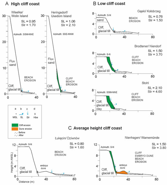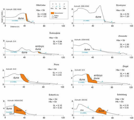 Figure 6 presents different sea levels at the same time in relation to varied shore heights in selected areas. Given similar beach heights, a higher sea level and waves caused higher run-up to the shore, which influenced the amount of losses. The higher the run-up of waves (SLr) related to sea level height (HSL), the larger the coast erosion observed. The change in coast retreat was also related to beach height (Hbe). This relation is analysed in part of the material described below.