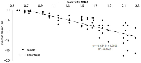 The factor that influences the extent of erosion is the sea level and wave height, expressed as the maximum run-up of water on the coast [24]. The height of run-up is an important indicator of the potential value of dune retreat during the storm. It is not directly related to the sea level but is a result of the height of waves that are generated by the wind during the storm.