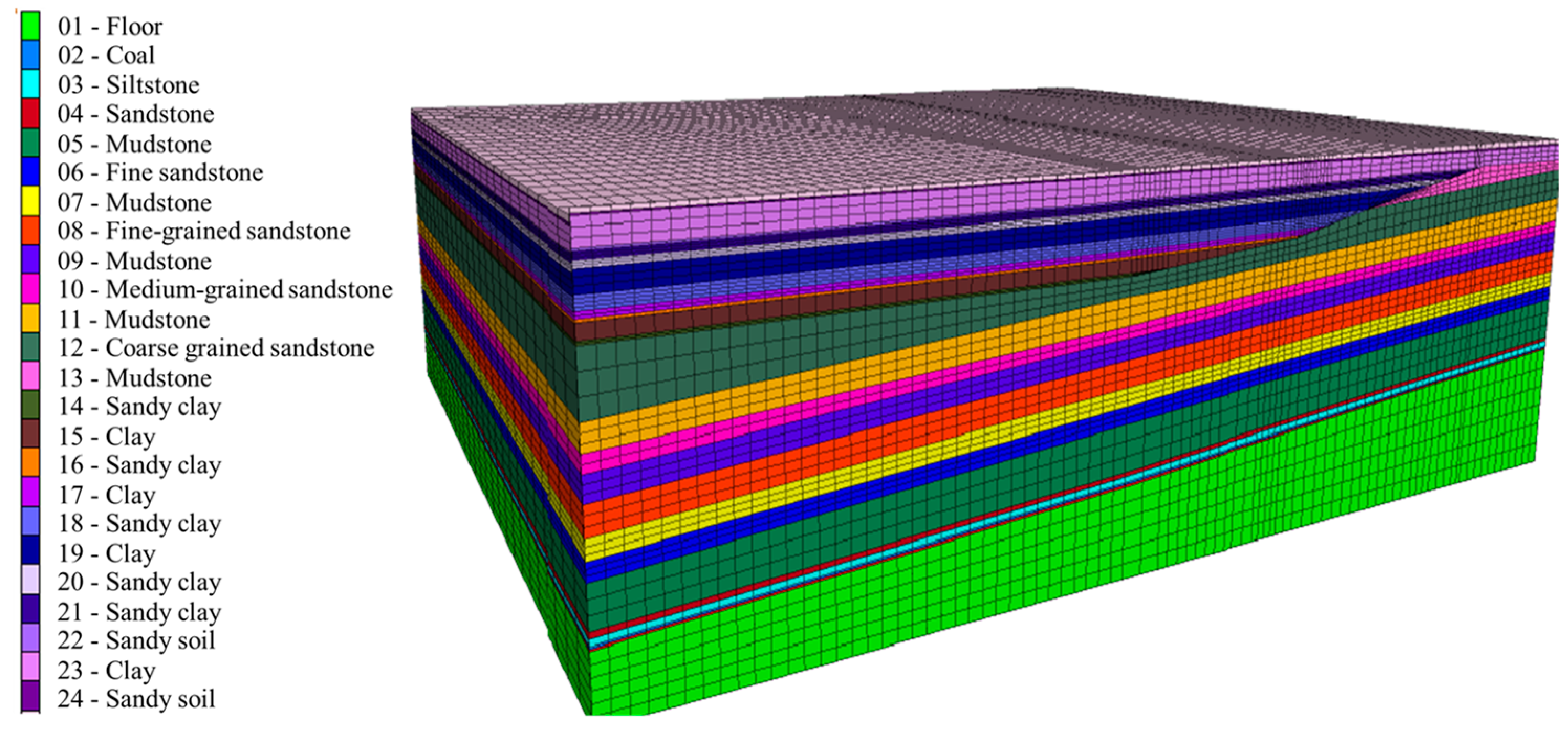 - Singh, R.; Rao, N.S.; Narayan, I.D.; Kumar, N.; Doley, T.; Bandyopadhyay, D.; Kisku, D.K. Application of 3D Numerical Simulations to Forecast Mine Seepage and Groundwater Flow Conditions with Respect to Progressive Coal Mining Activity. Environ. Dev. Sustain. 2024, 26, 22367–22388. [Google Scholar] [CrossRef]