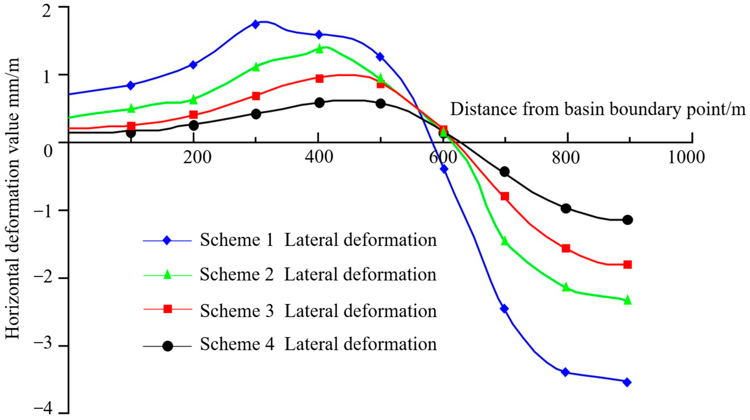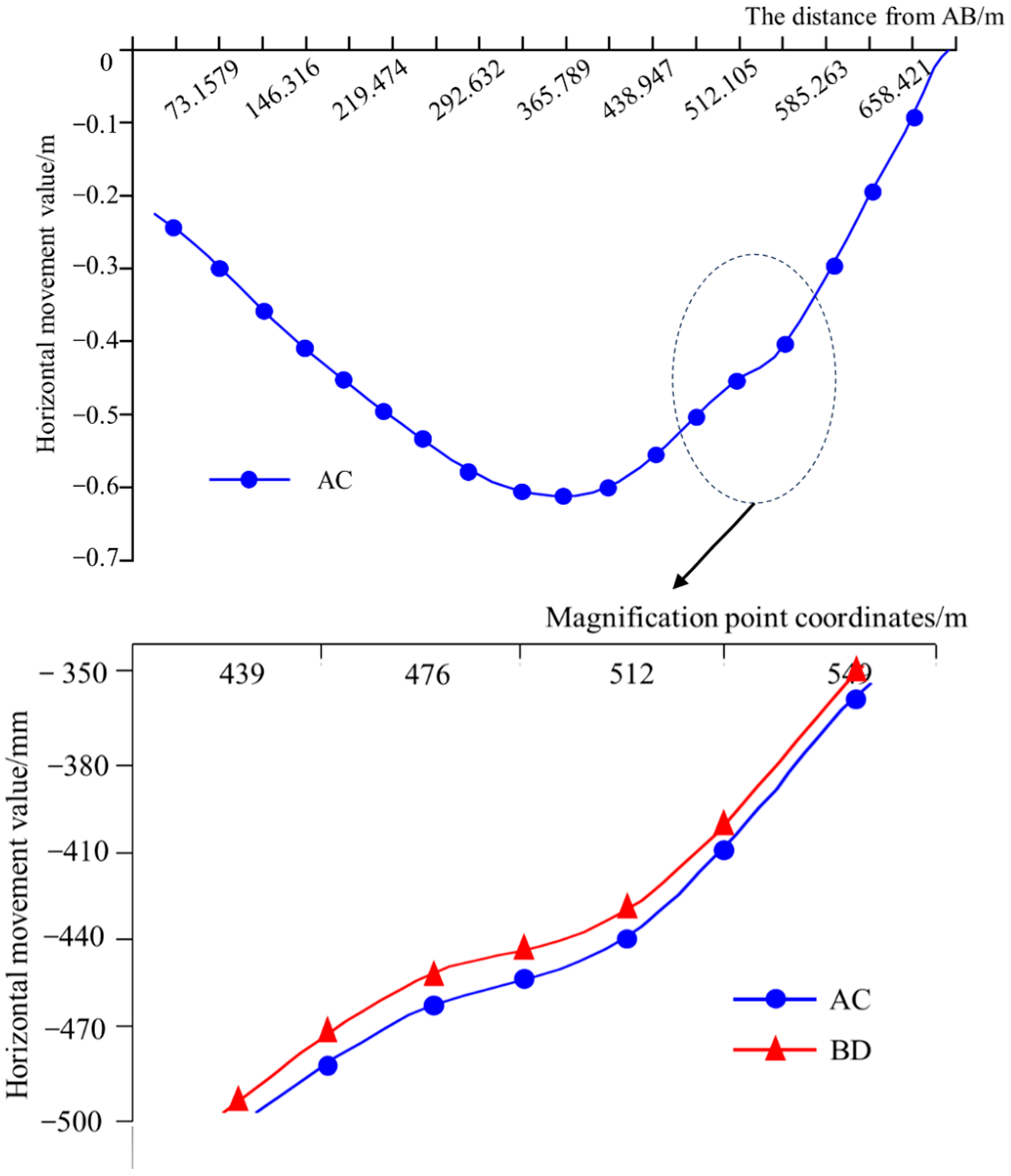 - Taking the 3205 working face of a certain mine as an example, the mining subsidence characteristics in its strike direction are studied. The analysis of monitoring data shows that under the influence of mining, the sandy soil layer in the unconsolidated layer moves integrally along the downhill direction of the basin (seepage direction), and a large displacement difference is generated with adjacent strata, causing discontinuous horizontal deformation. The measured results verify the regular conclusions of numerical simulation and theoretical analysis.