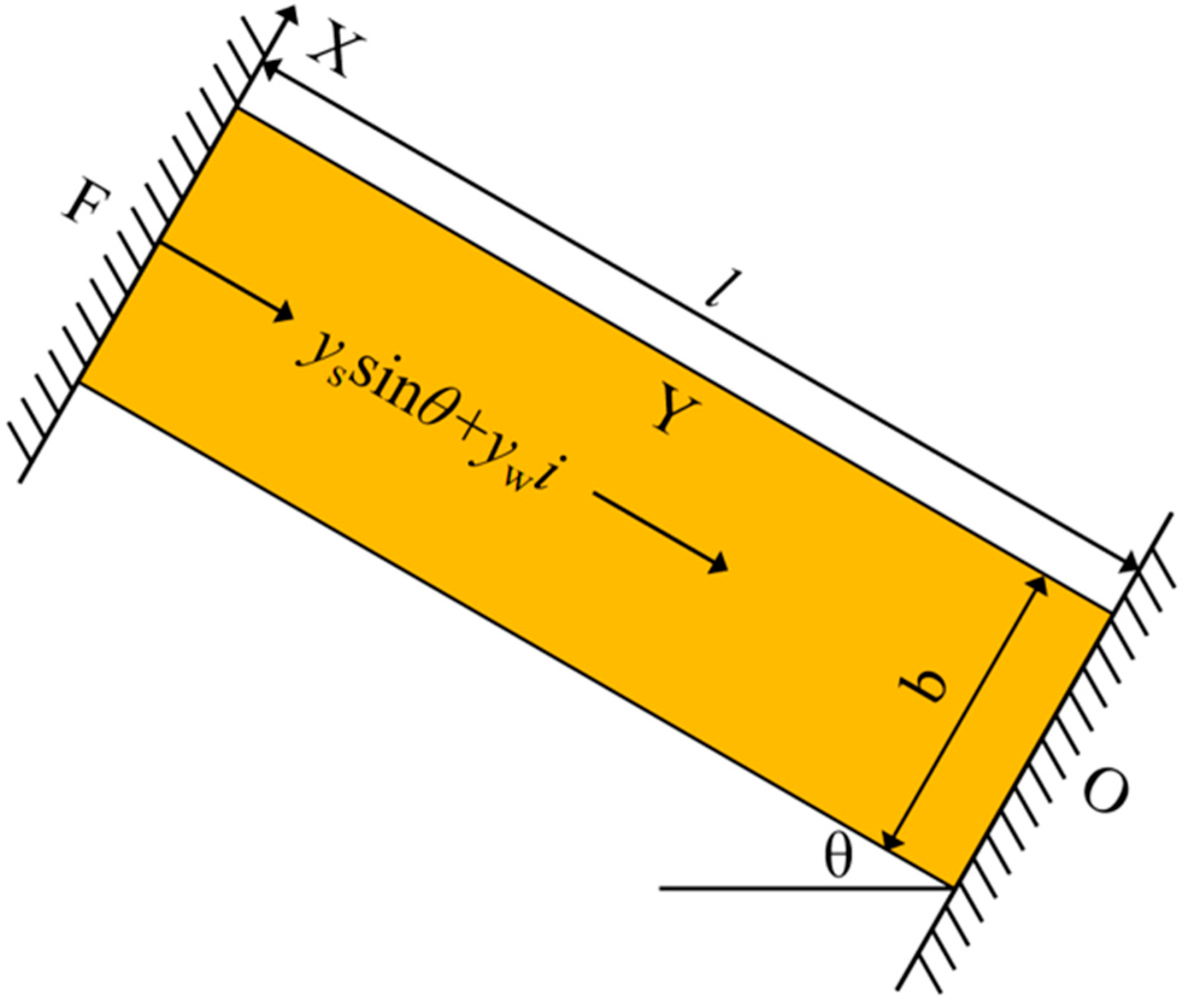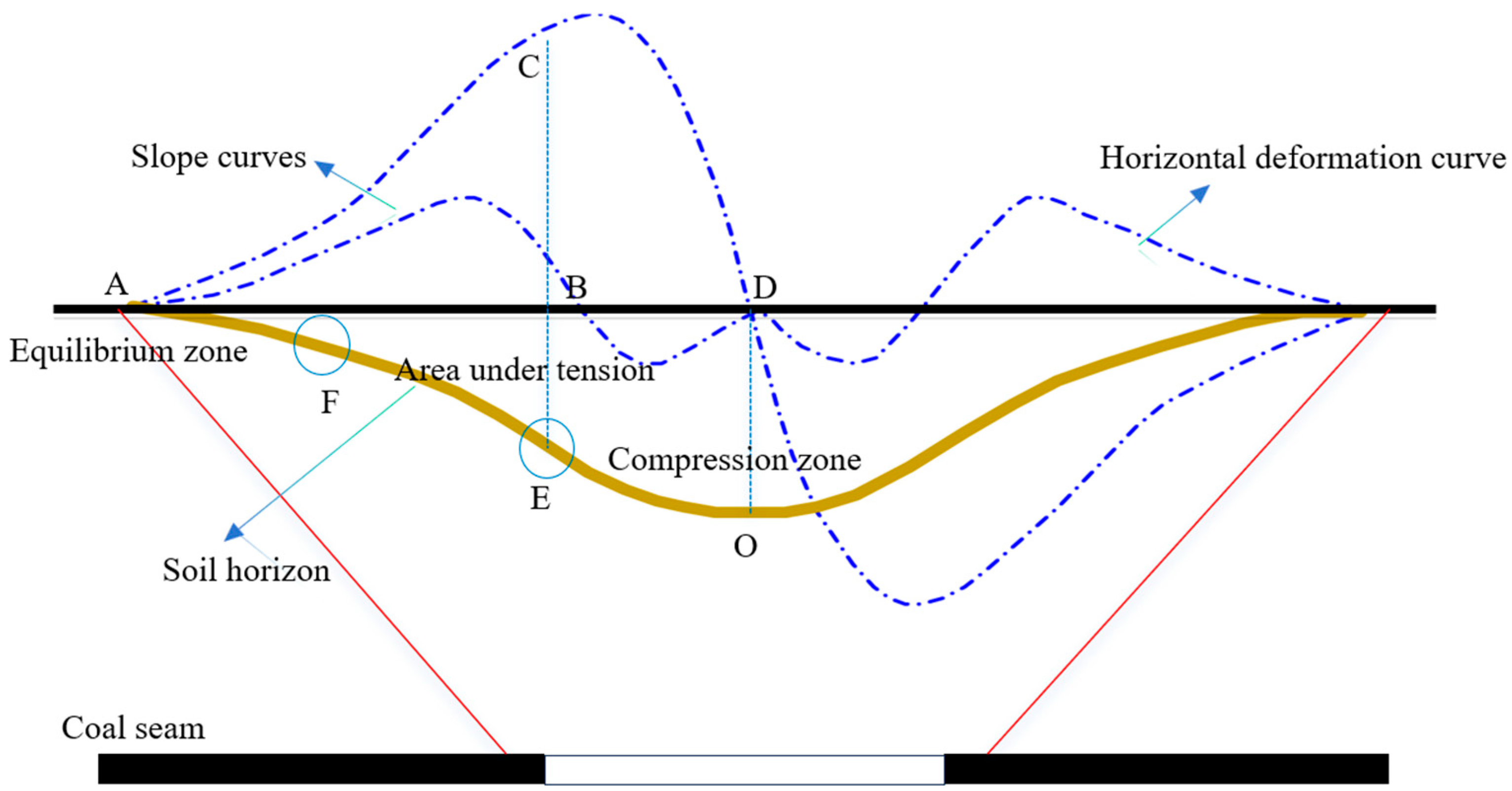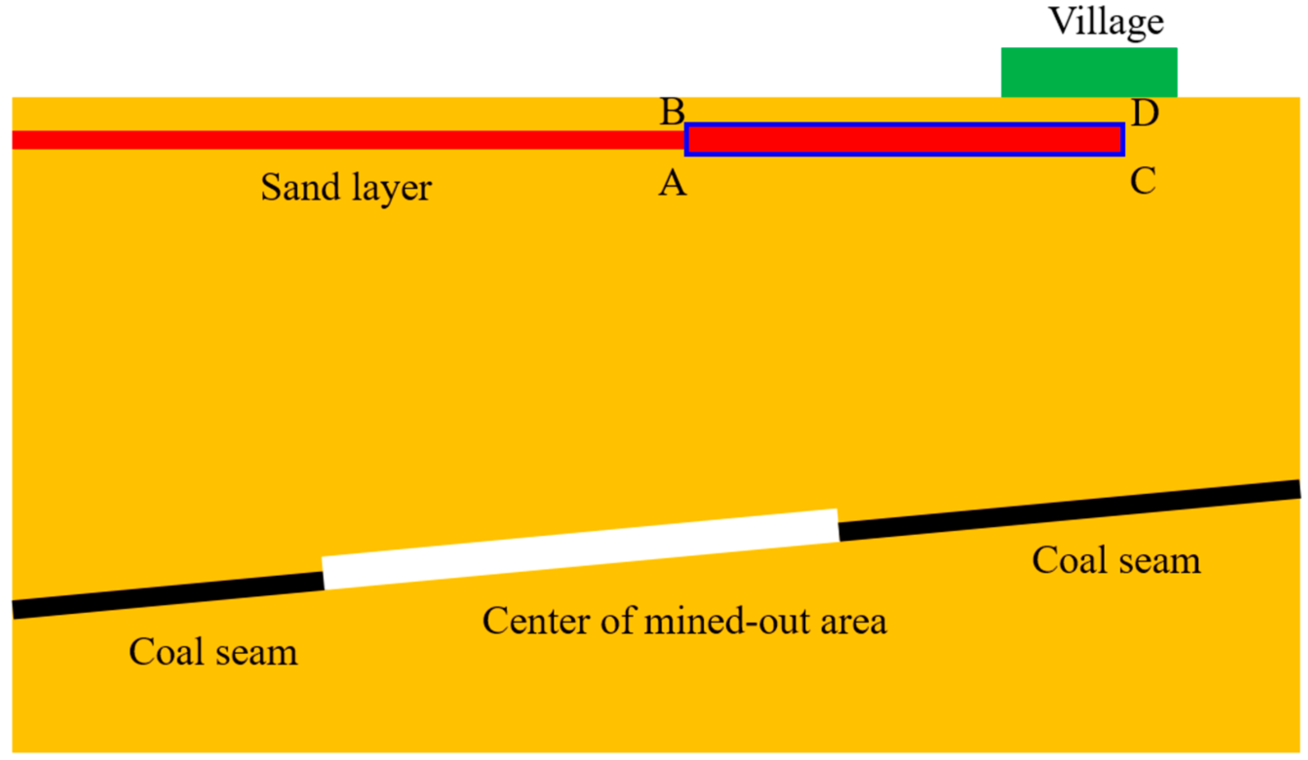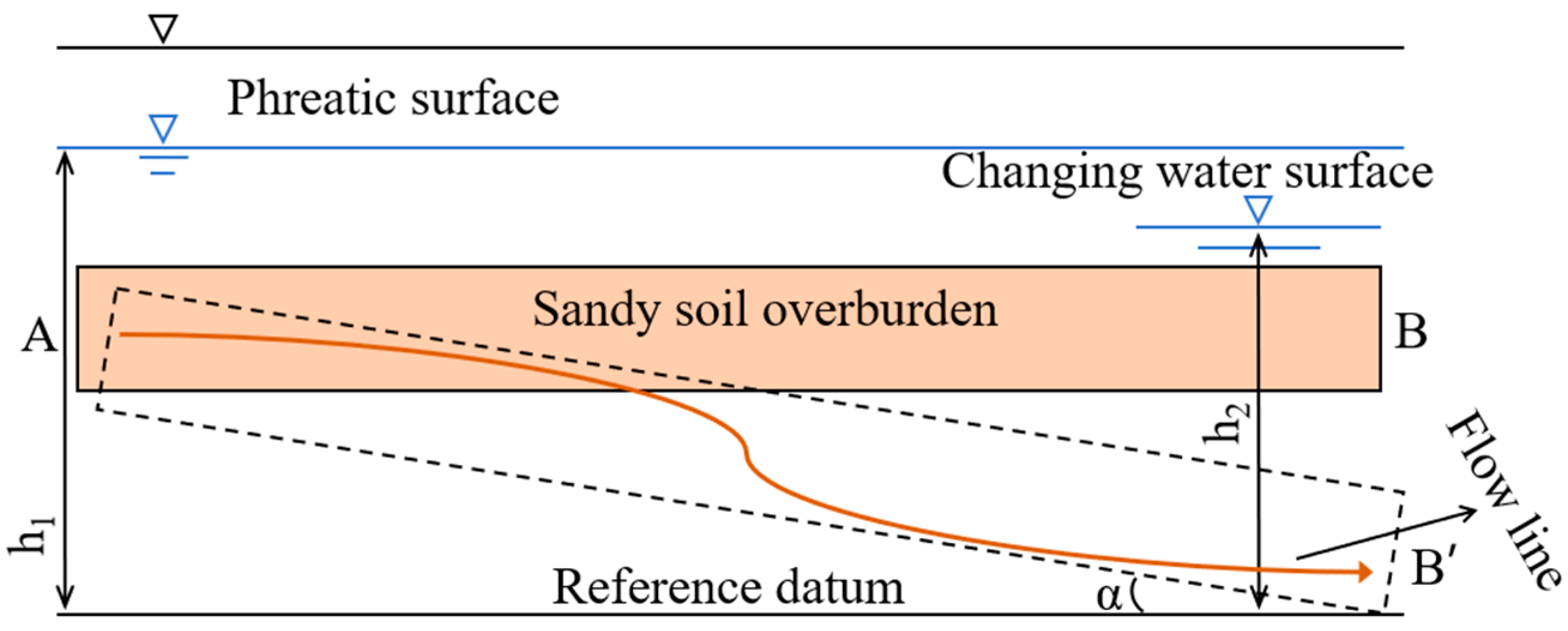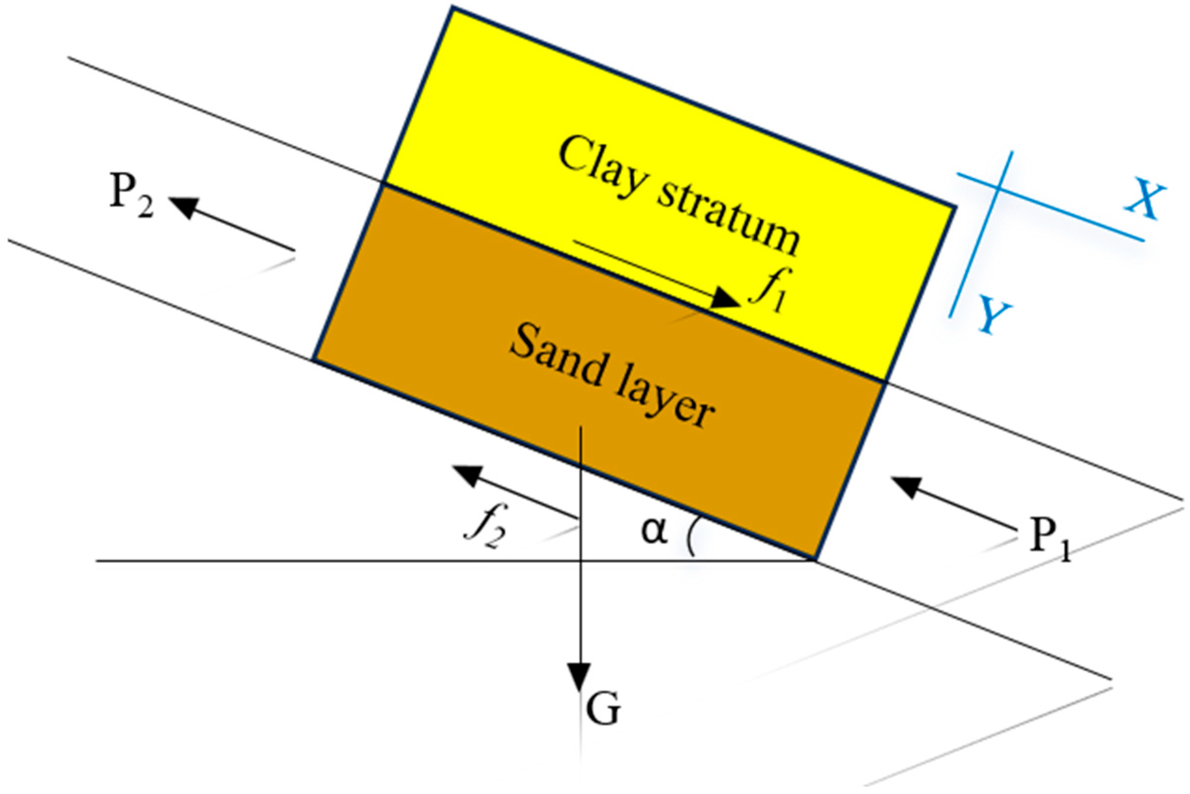 - By establishing a mechanical model of the sandy soil layer, the relationship between the stress state of the soil layer and surface deformation is reasonably explained. When the sand interbed is unsaturated soil, dislocation occurs between the upper and lower surfaces; the dislocation value of the upper and lower surfaces during the subsidence process is , which is proportional to the thickness and interlayer friction force. When the sand interbed is a saturated soil mass, a soil flow phenomenon occurs when the critical hydraulic gradient is reached, and the sandy soil layer shows overall movement; however, due to the absence of friction force on the bottom surface of the overlying soil layer, large displacement occurs, eventually leading to cracks on the surface.