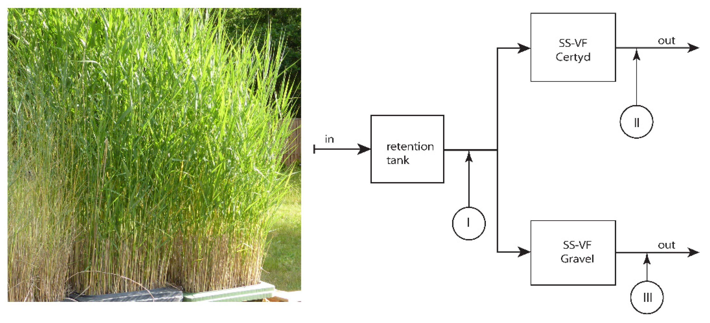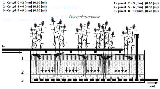 Figure 1 presents a cross section of both beds. Figure 2 presents a view of the installation and an illustration of the scheme, with sampling points. The filtration medium was composed of three layers (gravel or Certyd) with a total depth of 0.8 m. The alternative substrate known as Certyd, which is covered by a patent [], is a lightweight sintered ceramic aggregate made from coal or lignite combustion ashes produced during cogeneration heat and power (CHP) plant operation. Certyd as an aggregate has numerous advantages []. It is chemically inert; it is lightweight, porous and durable; it does not degrade; and it can be reused. The CW beds were supplied with domestic sewage from a common retention tank (Figure 2). The research installation, located in the Podlaskie Voivodeship (Poland), was operating in real conditions, and the temperature of sewage in the retention tank was dependent on meteorological conditions. The beds were operating in parallel, each with the same hydraulic load of 0.1 m3 m−2 d−1 (m d−1) which is typical for domestic sewage treatment [,]. The beds were planted with reeds of Phragmites australis ssp. australis.