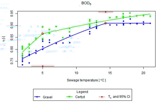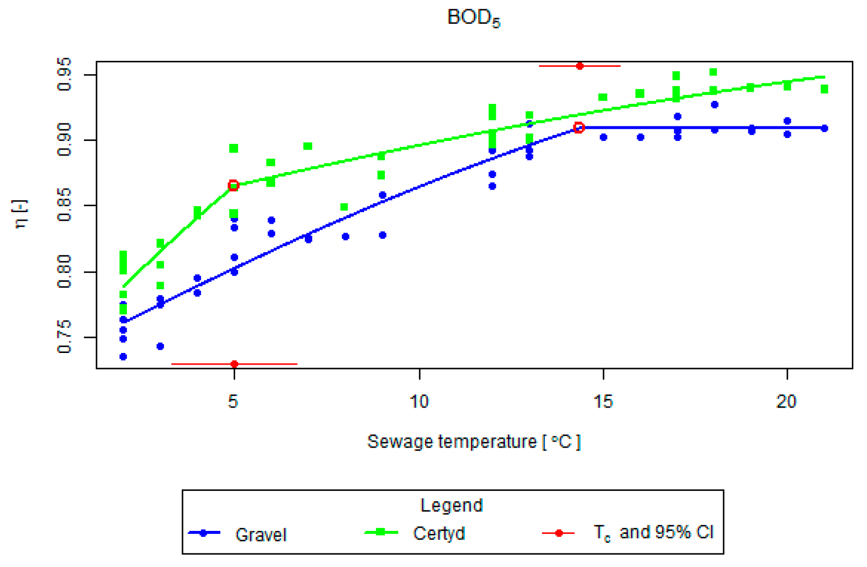 For the amount of organic matter defined as BOD5, the gravel-filled bed changed its behavior at = 14.4 °C. Above this temperature, efficiency depended only on the load ( = 1.0000). Below this temperature, it increased quite rapidly ( = 1.0426). At very low temperatures ( < 5.0 °C), the Certyd-filled bed exhibited a rapid increase in purification efficiency. Above 5 °C, this increase slowed considerably.