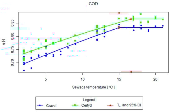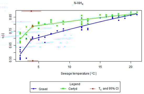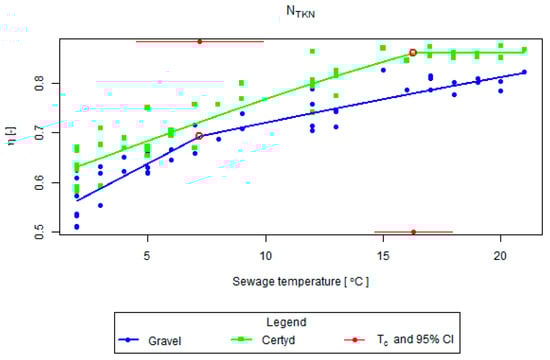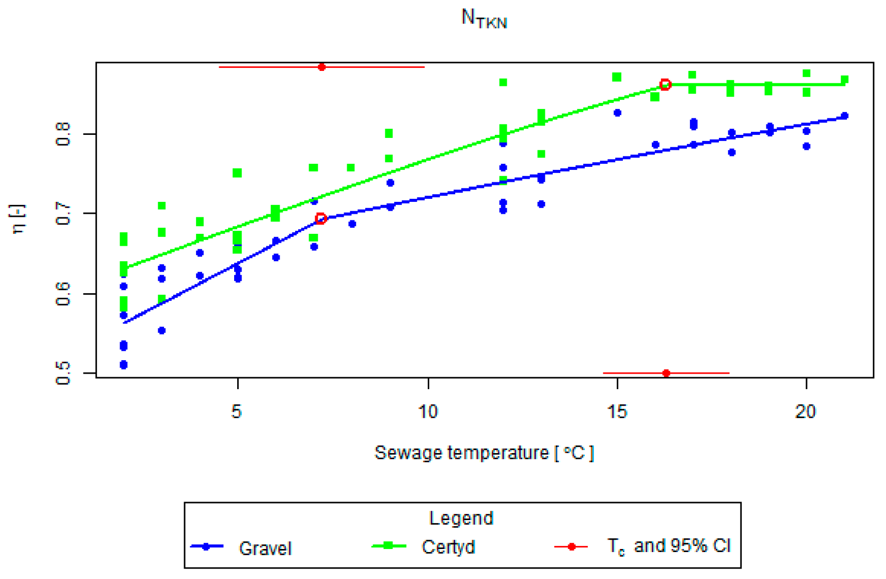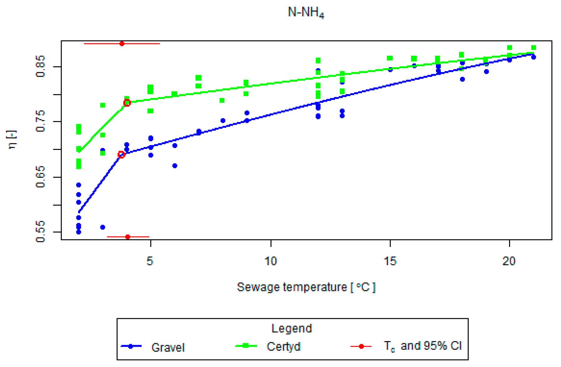 The curves of the Kjeldahl nitrogen removal model were characterized by different critical temperature values (16.3 °C—Certyd bed; 7.2 °C—gravel bed). The Certyd bed did not remain sensitive to temperature changes after exceeding the critical temperature, while the gravel bed further increased its efficiency ( = 1.0276 for TKN). At temperatures lower than the critical temperature, the gravel bed remained more sensitive to temperature changes ( = 1.0704 for TKN) than the bed with Certyd filling ( for TKN).