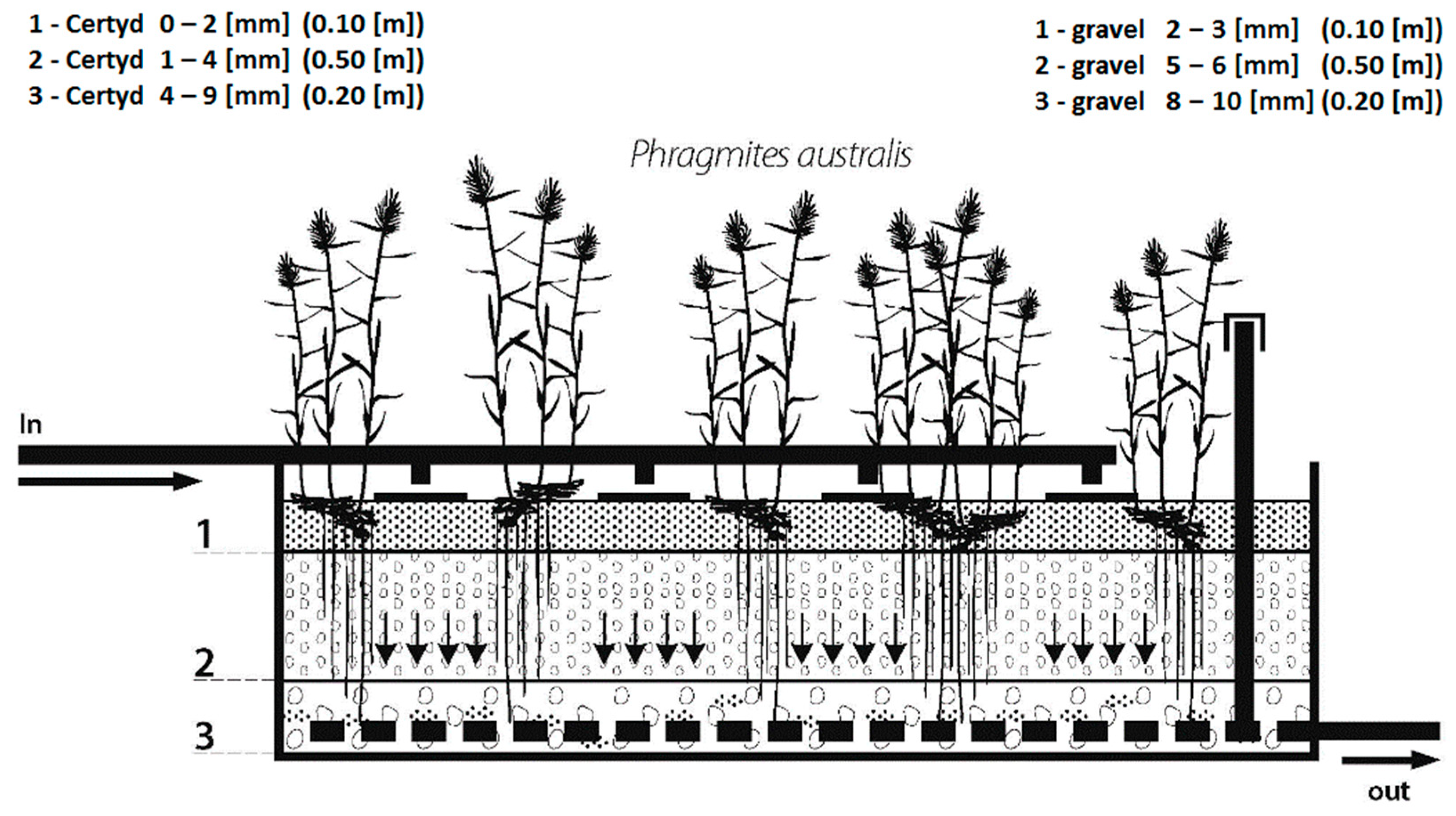 The Certyd aggregate used as filling by the authors at their research installation is a lightweight sintered ceramic aggregate made from coal or lignite combustion ashes []. A bed with the new filling was compared to one filled with gravel using a temperature-dependent model. The issue of modeling the functioning of constructed wetlands is one of the most important challenges in the field [,].