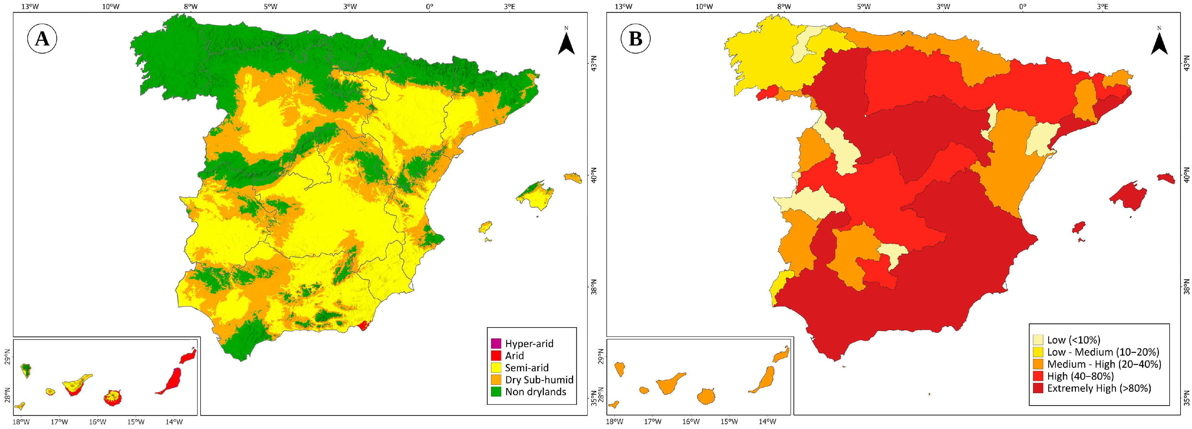 - Beguería, S.; Trullenque-Blanco, V.; Vicente-Serrano, S.M.; González-Hidalgo, J. Aridity on the Rise: Spatial and Temporal Shifts in Climate Aridity in Spain (1961–2020). Int. J. Climatol. 2025, 45, e8775. [Google Scholar] [CrossRef]
