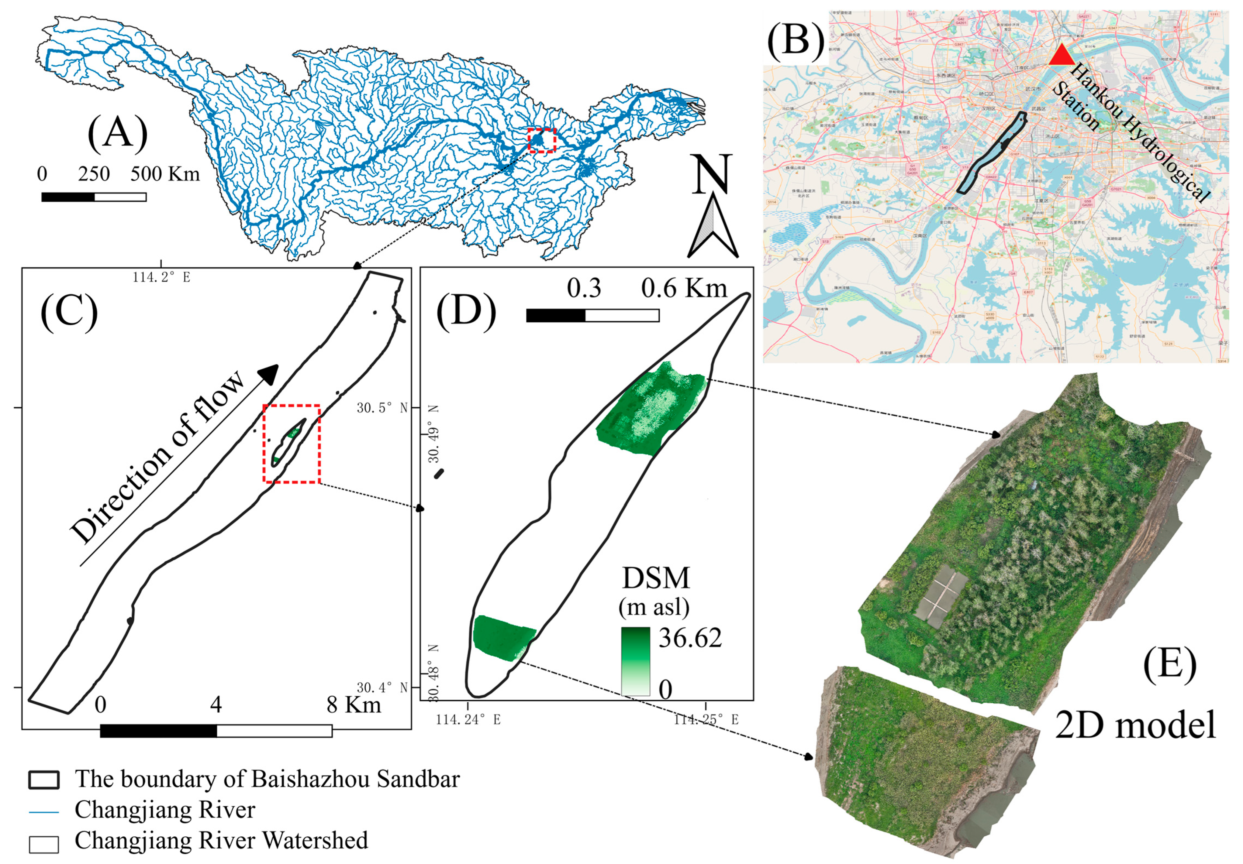 Figure 1. Location of the study area, (A,B) are the locations of the BSZ sandbar at the Changjiang River Basin and Wuhan city, respectively, (C) is the part of the river channel where the BSZ sandbar is located, (D) is the boundary of the BSZ sandbar and the Digital Surface Model (DSM) of the two mapped areas, (E) is the 2D model of the sampling areas.