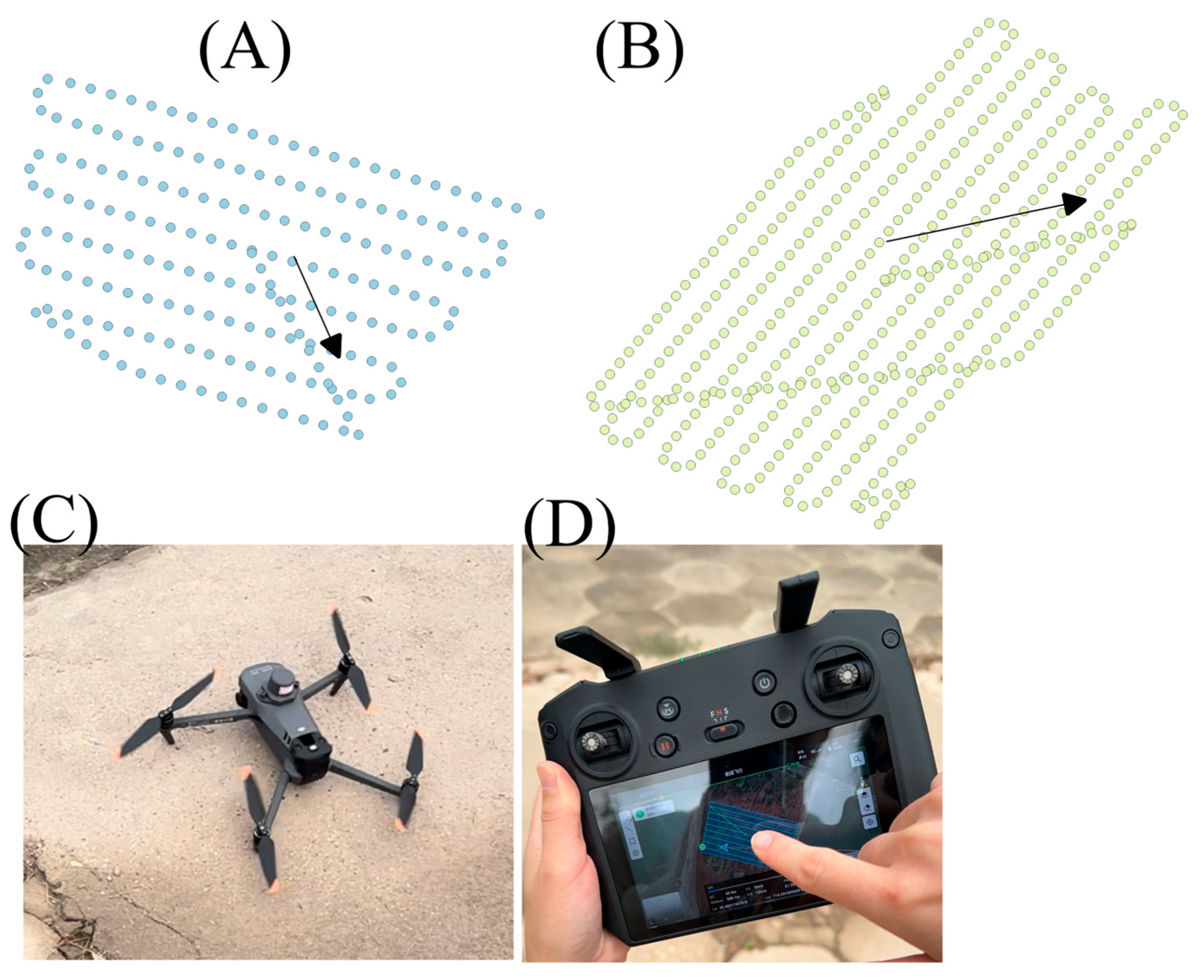Figure 2. (A,B) are the flying paths of the left (A1) and right (A2) study areas, respectively. (C,D) are the aerial vehicle and the controller, respectively. Notably, the arrows in (A,B) indicate flight direction.