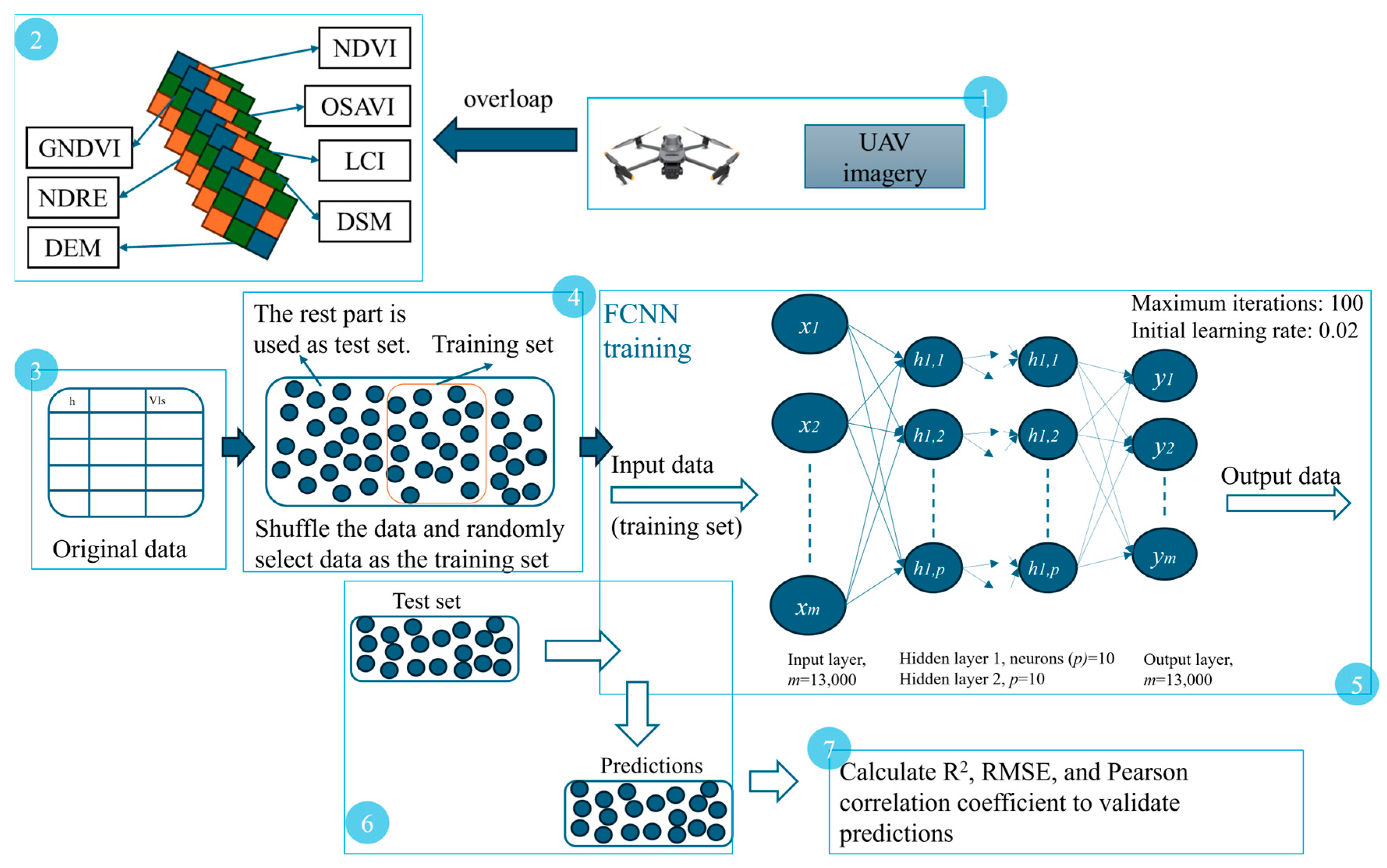 70% of the vegetation height h, NDVI, and GNDVI values estimated from the UAV images are used to train the FCNN model, where h is the dependent variable and NDVI and GNDVI are the independent variables. The other 30% of the NDVI and GNDVI values are imported into the trained model to predict h. The predictions are then compared to the original vegetation height to verify the performance of the trained model.