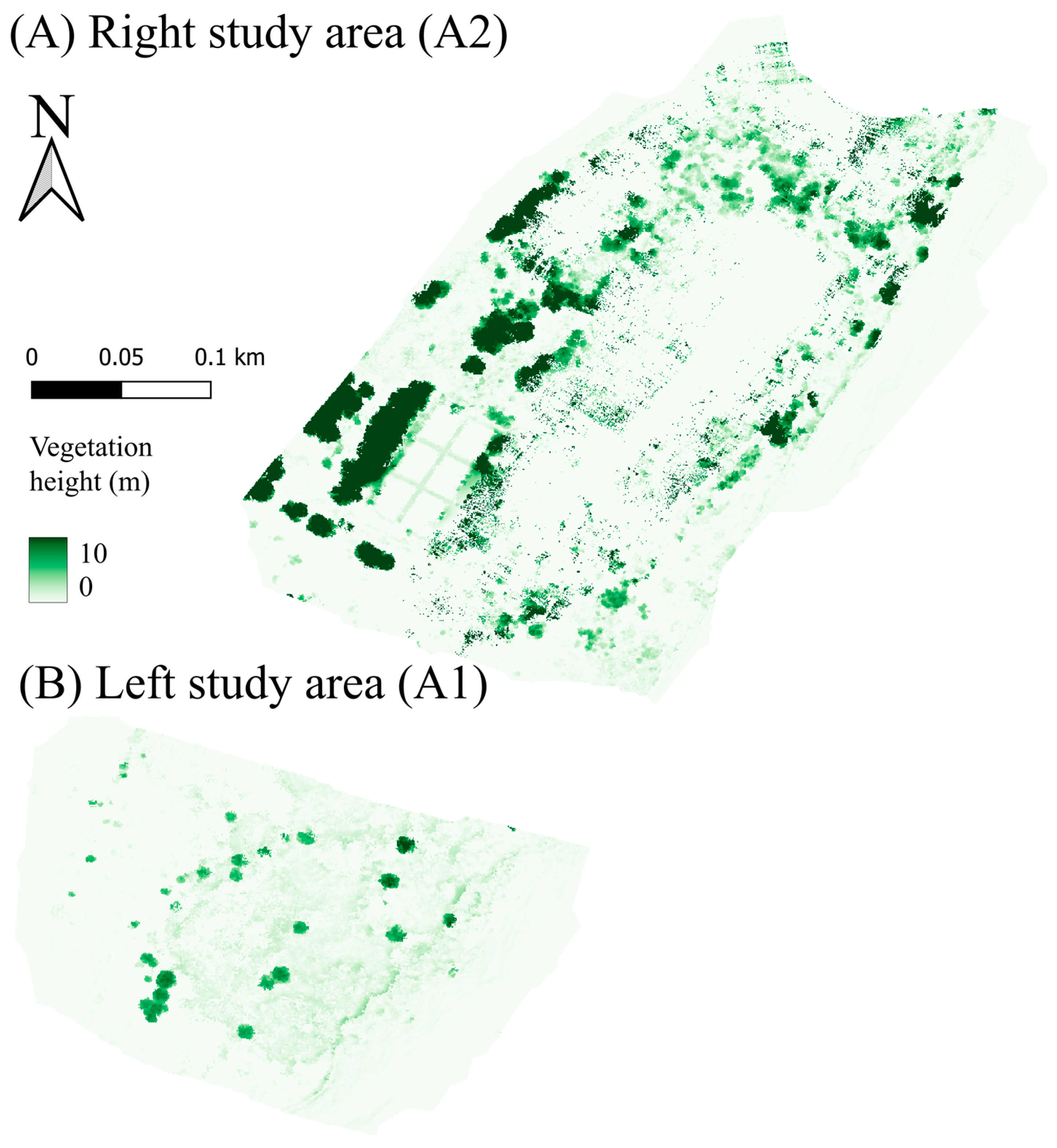 The distribution of the vegetation height of the two study areas estimated by DSM minus the vegetation-filtered DEM is illustrated in Figure 4. It can be noticed that the vegetation height of both A1 and A2 ranges from 0 to 10 m, with an average height of 0.81 m in A1 and 3.38 m in A2. The average vegetation height of the two areas is 2.10 m.