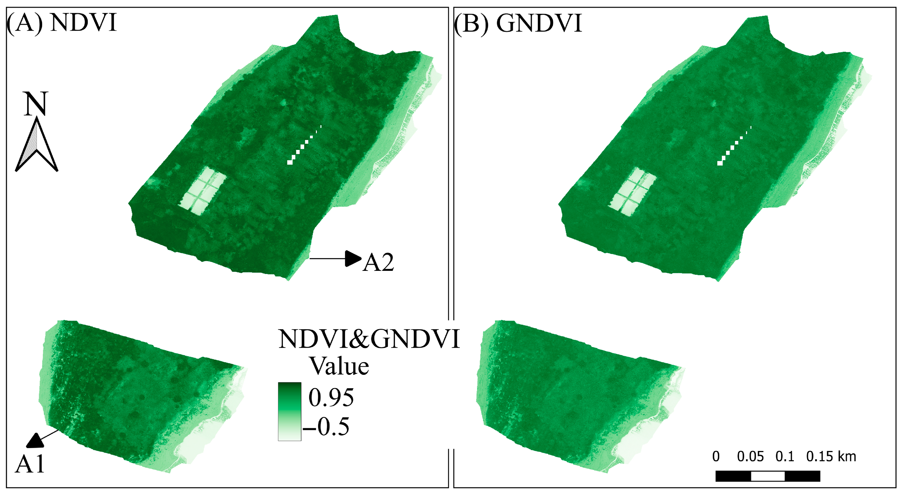 Moreover, the variability in the spatial distribution of NDVI values for A1 is greater than that of its GNDVI. The NDVI in A1 has a trend, with higher values at the border and lower in the middle, while the trend of GNDVI is not obvious. When it comes to the variability in the spatial distribution of NDVI and GNDVI values for area A2, they are more similar.