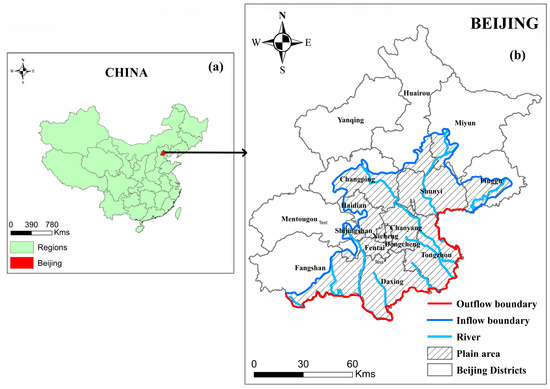 Study area. (a) General location in China. (b) Beijing Plain area river system and flow boundaries.