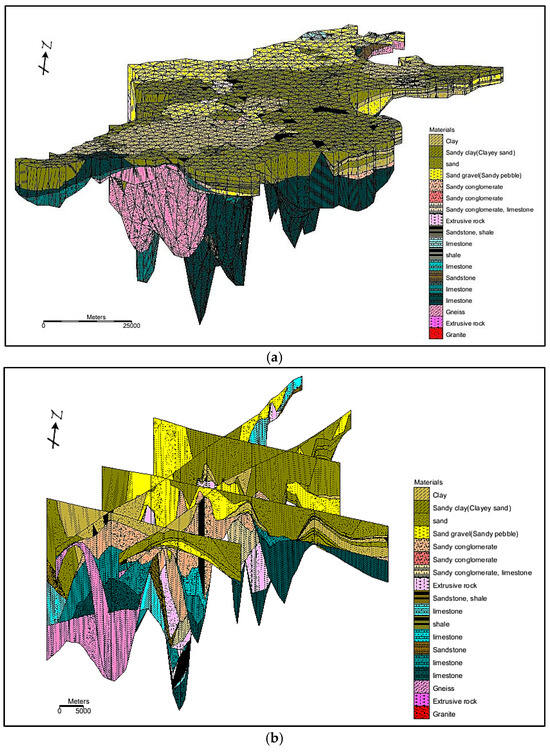 Research area geological map. (a) Geological model map containing bedrock. (b) Three-dimensional geological section containing bedrock.
