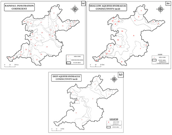 Zoning maps. (a) Rainfall infiltration coefficient. (b) Shallow groundwater hydraulic conductivity. (c) Deep groundwater hydraulic conductivity.