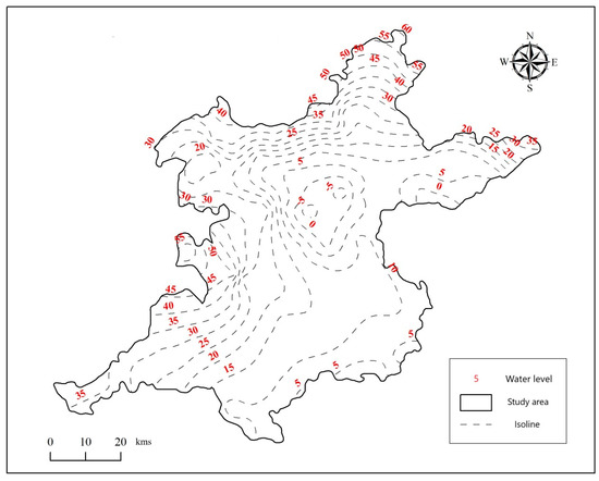 Interpolation was performed on the groundwater level in September 2021 to obtain the initial water level of the groundwater aquifer. Due to the lack of comprehensive long-term continuous observation well data on groundwater levels in the confined aquifers, the initial hydraulic heads of the confined aquifers were not available. The simulation period initial groundwater level map of the shallow unconfined aquifer is shown in Figure 7.
