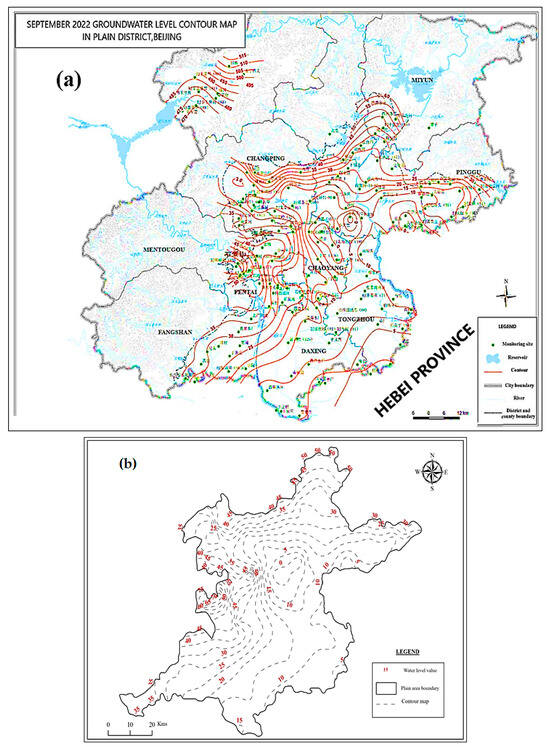 Contour maps in the shallow aquifer. (a) Groundwater level in the plain area of Beijing in September 2022. (b) Contour map of groundwater level from the model’s calculation.