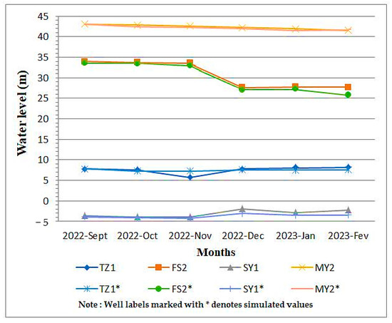 After completing the model calibration, the model was validated using the observed data for the period September 2022 to February 2023. Of the 122 long-term groundwater level observation wells, 34 typical observation wells were selected in each district to be presented in Table 6.
