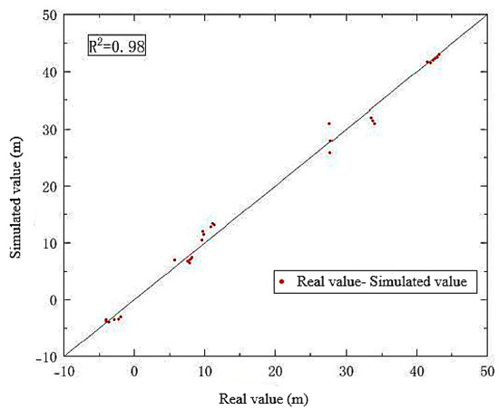 From the time series of water level changes (Figure 9) and the scatter plot of simulated observation values (Figure 10), it can be seen that the trend of water level changes calculated by the numerical model can basically represent the overall trend of water level changes. The error control is good, the reliability high and it is relatively consistent with the actual situation.