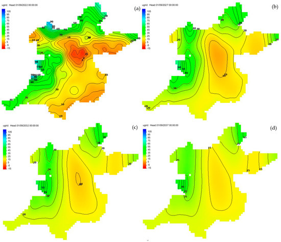 The simulated groundwater flow fields are shown in Figure 11. From Figure 11b to Figure 11d, under current conditions the groundwater level on the simulation period has changed mainly due to the rising trend of the groundwater level depression funnel located in the center of the study area. The range of the groundwater funnel has decreased but the lowest groundwater level is still located in the center of study area. Groundwater is still flowing from the northwest to the southeast.
