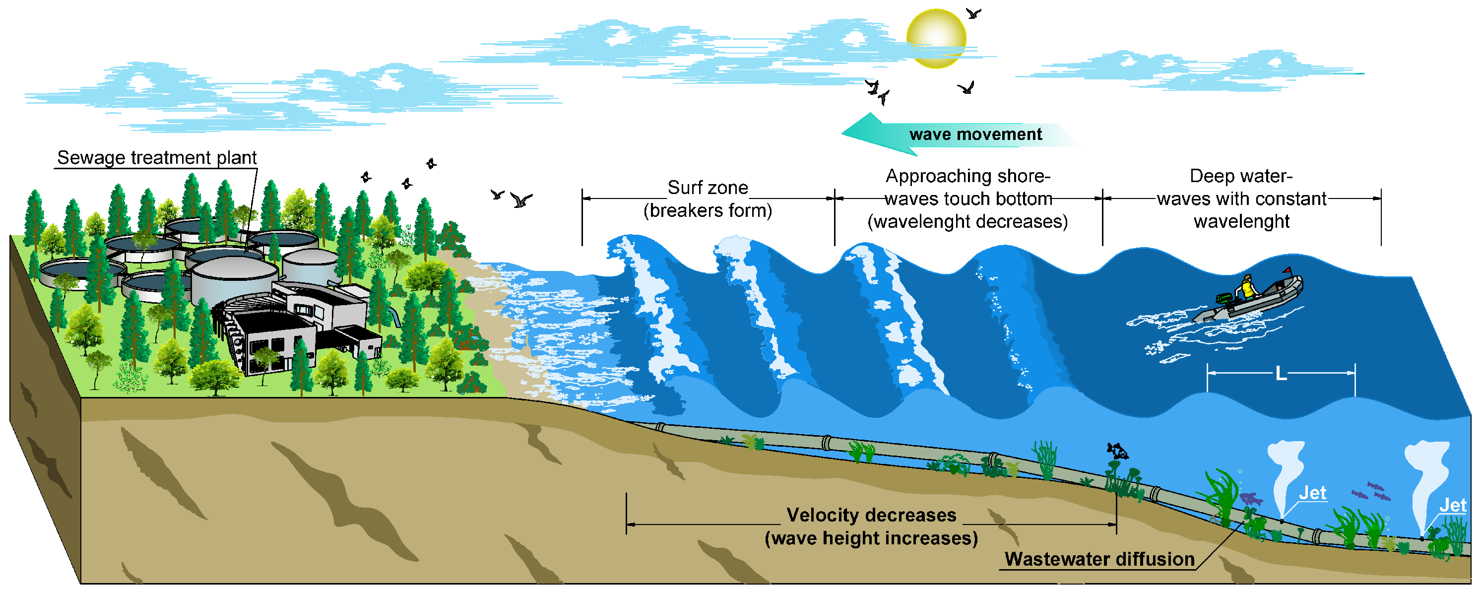 Figure 1 shows a schematic representation of jet discharge into the sea under wave conditions, also highlighting practical applications related to marine outfalls.