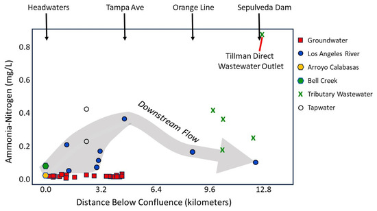 Groundwater is the dominant source of nitrate-nitrogen upstream of Sepulveda Basin. Wastewater provides an additional but lower concentration, but much higher mass loading of nitrate-nitrogen (Figure 8). High nitrate-nitrogen concentrations in groundwater are likely the result of legacy agricultural activities in the area []. Leaking municipal wastewater pipes are another possible source; however, the consistently elevated nitrate-nitrogen levels in groundwater are more characteristic of non-point sources than of localized leakage from underground pipes [].