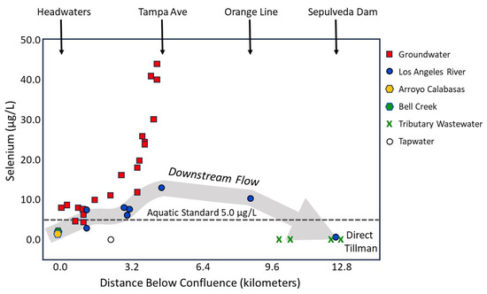 Selenium exhibited a strong contrast between surface and subsurface sources. Upstream tributaries contained only 2.1 to 2.3 µg/L, while groundwater samples ranged from 4.5 to 44 µg/L, with most exceeding the 5 µg/L aquatic life standard. Correspondingly, river selenium increased downstream from 2.9 µg/L at the uppermost site to 13 µg/L below Tampa Avenue before declining to 0.5 µg/L at Sepulveda Dam, reflecting dilution by selenium-poor wastewater (<0.4 µg/L) (Table 1).