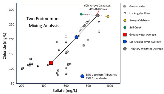 Concentration trends were further assessed by applying two-endmember mixing models to estimate the relative contributions of groundwater and surface-water sources to the Los Angeles River. Mixing models were developed between endmember waters to determine contribution of baseflow using various solutes collected in the study. The two-endmember mixing approach assumes conservative behavior of the selected solutes, or those not subject to significant transformation, adsorption, or precipitation within the mixing zone. In this study, chloride, sulfate, TDS, nitrate, and selenium were tested as conservative tracers. The model is based on the general mixing equation: