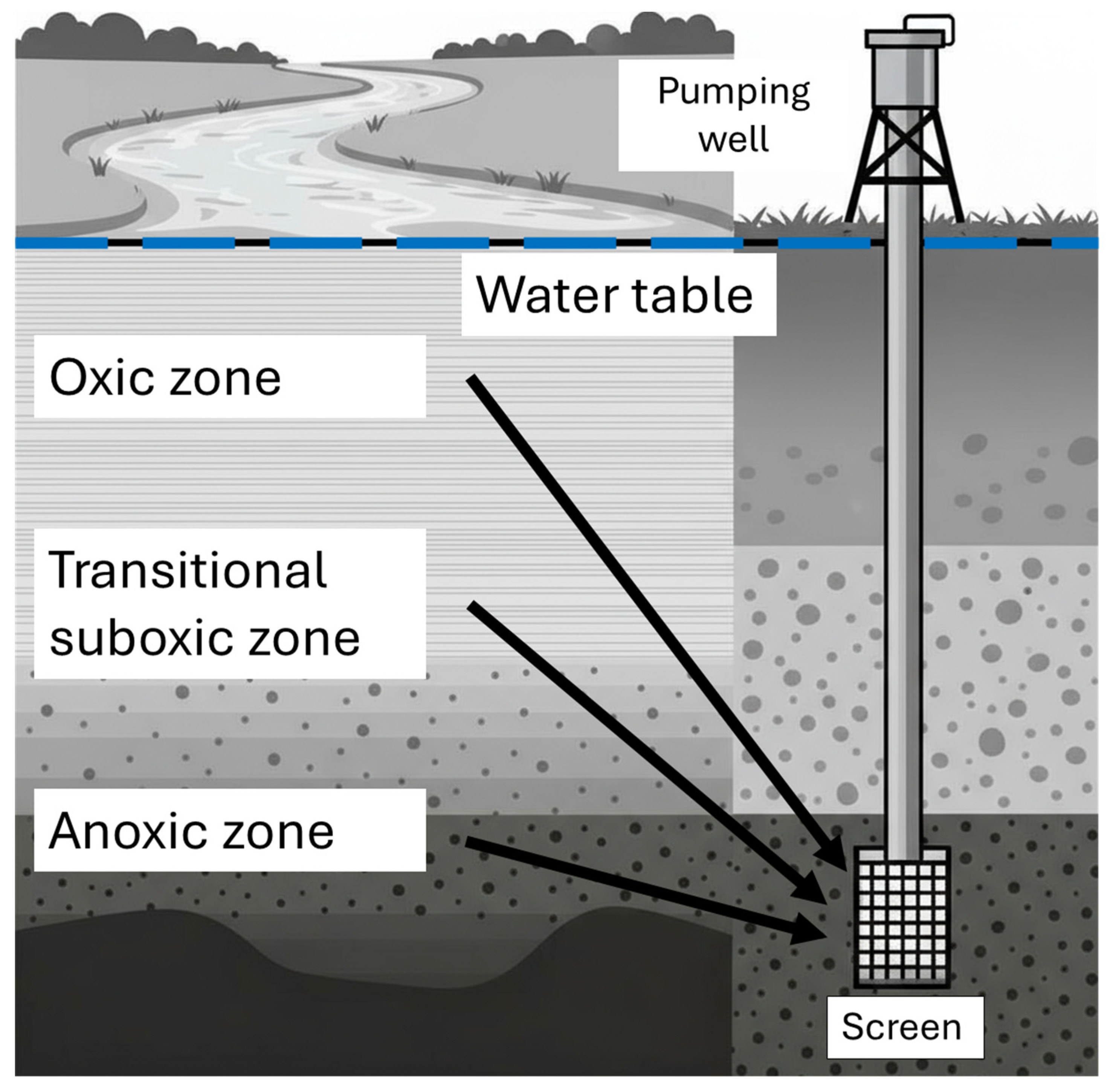 - Bai, J.; Yuan, Z.; Wang, J.; Yan, Y.; Hu, B.X.; Su, X. Migration and Transformation Mechanisms of Iron and Manganese during River Infiltration Affected by the Changes in Riverbed Sediment Thickness. J. Hydrol. 2024, 643, 132030. [Google Scholar] [CrossRef]