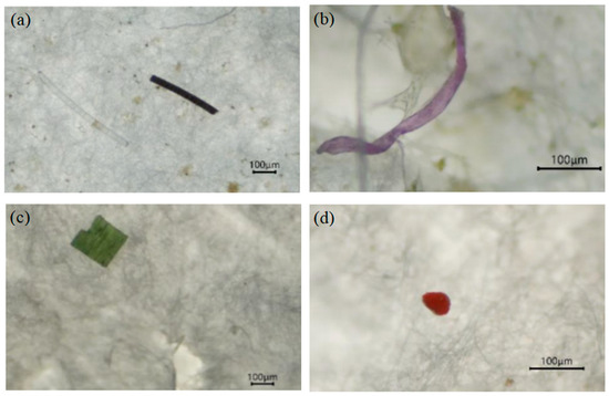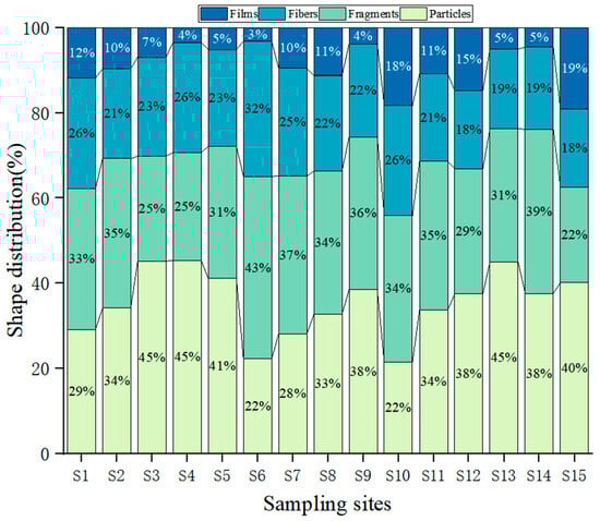 The filter membrane was examined under a microscope (Model AX880, OLYMPUS, Hachioji, Japan) using a “Z” shape scanning pattern to ensure comprehensive observation. Suspected microplastic particles were initially identified, photographed, and recorded in a laboratory notebook. Recorded information included particle shape, color, and size, with particle size defined as the length of the longest side. Based on established morphological classification schemes, the microplastics identified in this study were categorized into four primary types: fibers, films, fragments, and particles [28]. The distribution of these shapes is shown in Figure 2. Throughout the observation process, the light source was adjusted as needed to accurately reveal the true shape and color of the particles, minimizing misjudging the color and shape of the suspected particles due to lighting or viewing angle.