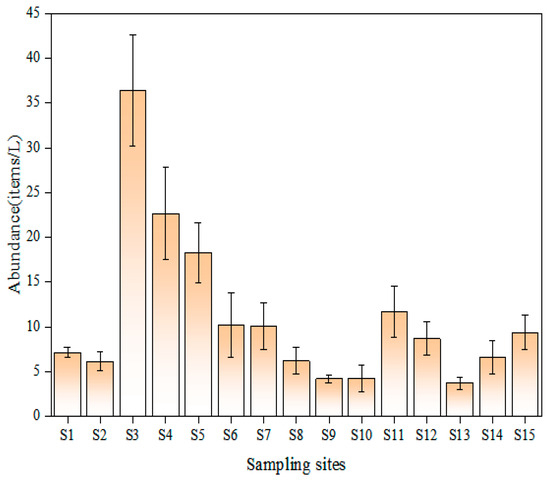 The abundance distribution of microplastics in the surface water of the Feiyun River basin is shown in Figure 3. Microplastics were detected at all 15 sampling sites. The abundance of microplastics in the surface water ranged from 3.7 to 36.4 items/L, with an average of 11.0 ± 2.39 items/L. Microplastic concentrations typically range from a few to several hundred items per liter. Since the increase in microplastics research in 2016, scientists have systematically investigated microplastic pollution in China’s aquatic environments. The average abundance of microplastics in freshwater environments was reported to be 10.62 ± 36.99 items/L [20]. Jin [19] examined canal water in southern Jiangsu and found microplastic abundances ranging from 3.41 to 19.07 items/L, with an average of 9.59 ± 3.95 items/L. The microplastic abundance observed in the Feiyun River basin in this study is comparable to the levels reported for major urban agglomerations worldwide.