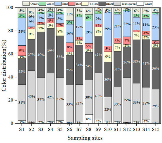 Color distribution of microplastics in surface water of the Feiyun River basin.