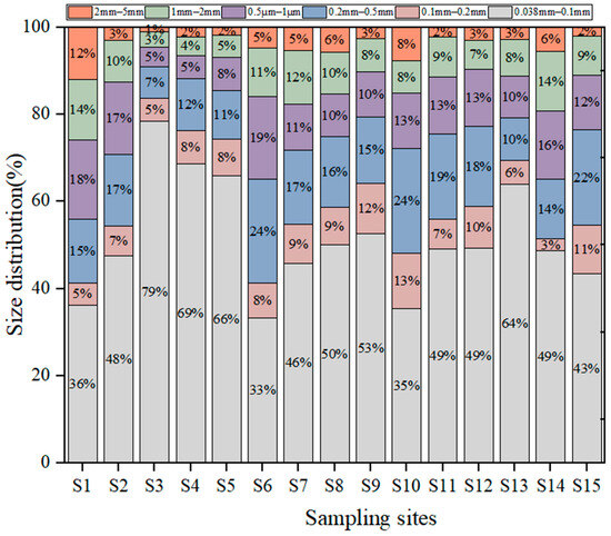 The size distribution of microplastics in the surface water of the Feiyun River basin is shown in Figure 6. A total of 15% of the microplastics were in the size range of 0.0380–1 mm, while 15% ranged from 0.2–0.5 mm. Overall, 79% of the microplastics were smaller than 0.5 mm, and their abundance decreased with increasing particle size. In the Liangfeng River basin of Guilin, Guangxi Province, 57.89–95.12% microplastics were found to be small in size (0.05–0.33 mm) [41]. In Wenzhou, Zhejiang Province, it was found that MP less than 200 μm in water and sediment accounted for 79.3% and 69.1%, respectively in the range of 100–200 μm of microplastics in Sanyang wetland [42]. Similarly, in the Qiantang River section of Hangzhou, microplastics that are smaller than 1 mm account for 60% of the microplastics in the surface water [43]. Still, in the Renhuai watershed of the Chishui River, 63.9% of the microplastics were found to be within the 0.5–1.0 mm range [44], comparable to our findings for the Feiyun River.