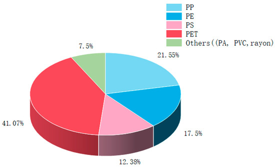 The polymer composition of microplastics in the surface water of the Feiyun River Basin was identified using laser micro-Raman spectroscopy shown in Figure 7. The results revealed that the microplastics were predominantly composed of polyethylene terephthalate (PET, 41.07%), polypropylene (PP, 21.55%), polyethylene (PE, 17.50%), and polystyrene (PS, 12.38%). Other polymers, including polyamide (PA), polyvinyl chloride (PVC), and rayon, collectively constituted 7.50% of the total, with each individually accounting for less than 3%. PET, PE, PP, PS, and PVC are widely used plastics in daily life. Polyethylene terephthalate (PET) is an aliphatic polyester commonly used in the production of household goods such as clothing, carpets, home textiles, beverage bottles, and packaging bags. It dominates the production of synthetic fibers. Polyethylene (PE) is widely used in storage containers and is a common material for plastic bags and plastic wrap. Polypropylene (PP) is commonly used in the manufacture of plastic products such as buckets, baskets, agricultural woven bags, plastic film, packaging films, packaging materials, and fishing nets, and has been identified in numerous experimental studies as a major component of environmental microplastics [45]. Polystyrene (PS) is commonly used to produce disposable tableware. It is worth noting that although the theoretical density of PET is higher than that of saturated NaCl solution for flotation separation, PET is still identified as the main polymer.
