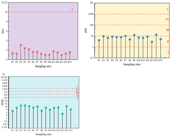 Ecological Risk Assessment Index chart. (a): PLI, (b): PHI, (c): PERI. Note: The classification criteria for risk levels (I–V) for each index are provided in Section 2.4.