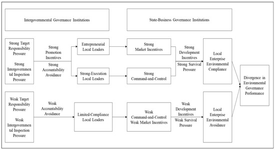 Environmental outcomes are generated through two mechanisms within the water governance process: vertical pressure transmission and horizontal incentive competition. Specifically, intergovernmental governance institutions create varying degrees of vertical coercive pressure and horizontal promotion competition incentives through target-responsibility systems and upper-level inspections. These are interpreted and assessed by local leaders, generating motivations for responsibility avoidance and the pursuit of promotion, which subsequently influence their governance decisions and the selection of state-business governance institutions. Since the survival pressures and development incentives produced by different state–business governance institutions vary in type and intensity, local enterprises conduct cost–benefit assessments under these differing conditions and adopt corresponding actions.