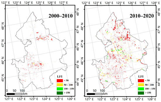 Changes in landscape fragmentation index (LFI) over the western Songnen Plain from 2000 to 2020.